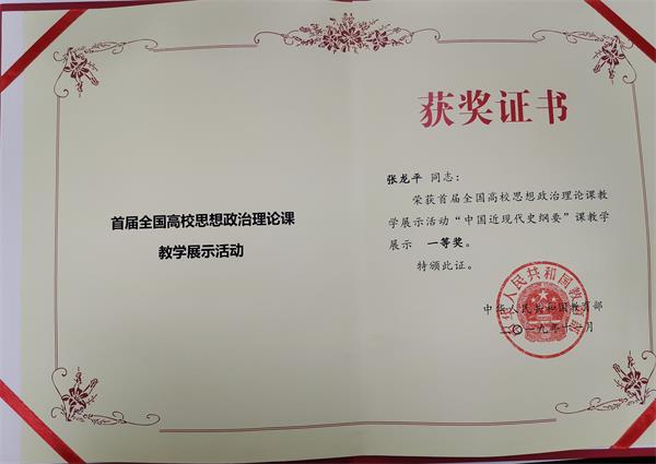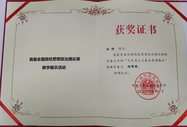 在首届全国高校思想政治理论课教学展示活动中,公司教师田明讲授的“马克思主义基本原理概论”荣获特等奖、张龙平讲授的“中国近代史纲要”荣获一等奖、黄颖黔讲授的“中国特色社会主义理论与实践研究”荣获二等奖,展现了公司思政课教师过硬的政治素质和精湛的教学能力。