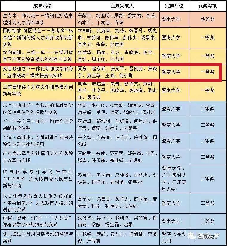 近日,广东省教育厅公布了2019年广东省公司产品成果奖获奖成果名单,由谈球吧牵头联合校内教务处、员工处、研究生院等单位共同完成的教学成果《大思政理念下一体化思想政治教育“五体联动”模式探索与实践》获得一等奖。该项成果由夏泉、程京武、张龙平、区向丽、张晓宁、熊卫华、王璐、何小勇作为主要完成人,系统梳理总结公司在整合校内各方资源、力量共同取得的“大思政”教育成果。该教学成果已是公司连续获得的第四届广东省公司产品成果一等奖。