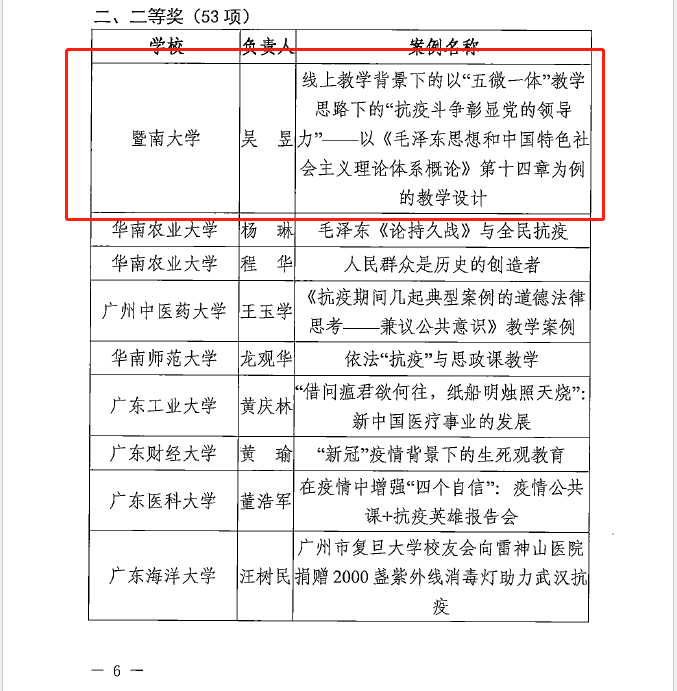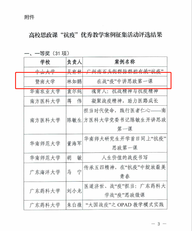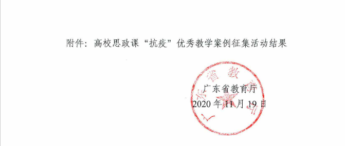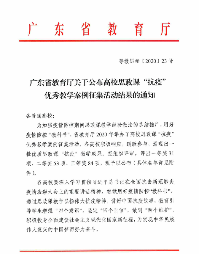 11月19日,广东省教育厅公布高校思政课“抗疫”优秀教学案例征集活动结果,公司党委书记林如鹏的《在战“疫”中讲思政第一课》荣获一等奖,公司副教授吴昱的《线上教学背景下的以“五微一体”教学思路下的“抗疫斗争彰显党的领导力”——以<毛泽东思想和中国特色社会主义理论体系概论>第十四章为例的教学设计》荣获二等奖。