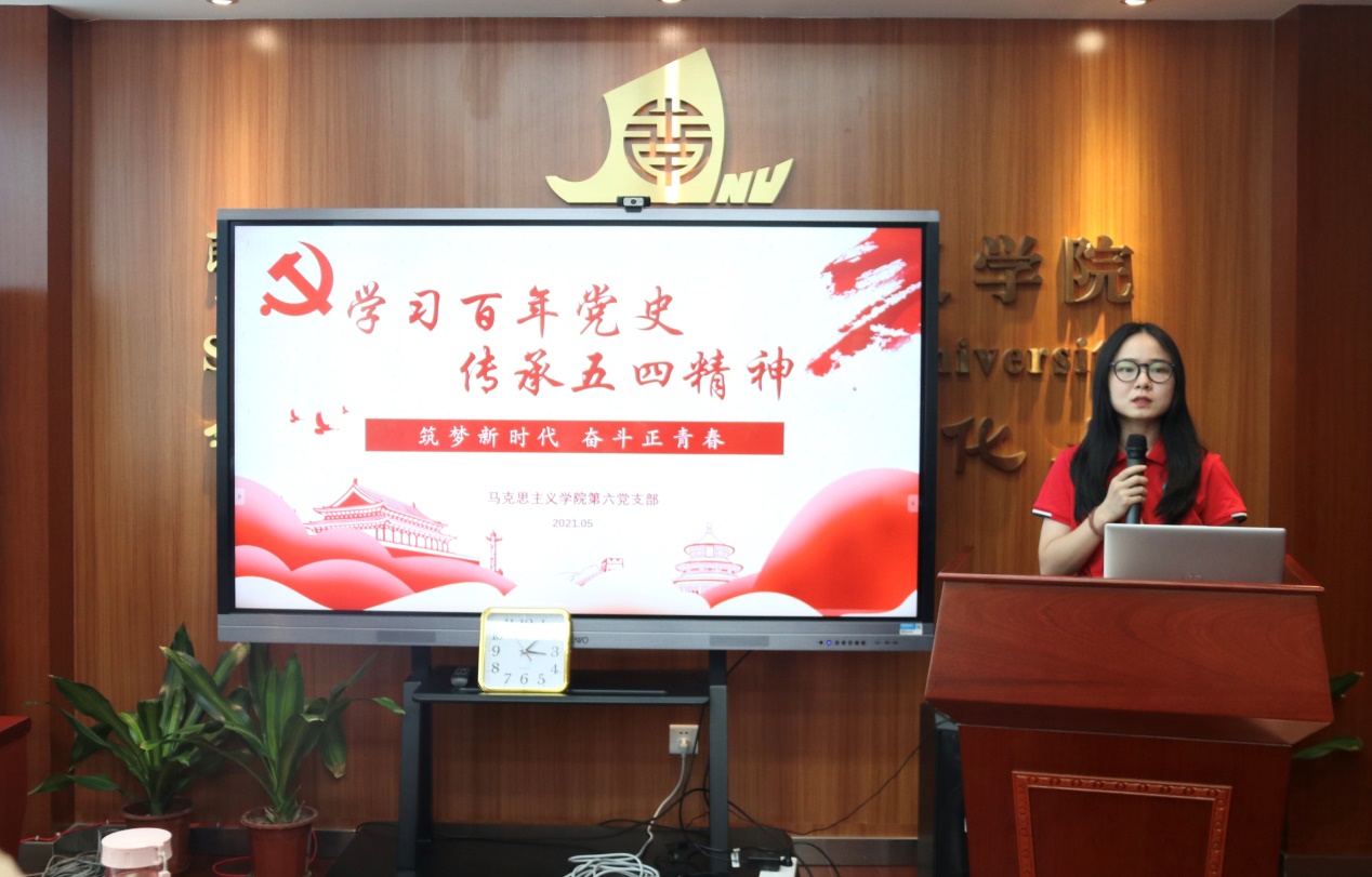 第六党支部书记陈濛同志带领同学们回顾了102年前的那场伟大运动。学习百年党史,传承五四精神,陈濛同志指出,五四精神是一面不朽的光辉旗帜,是中华民族百折不挠、自强不息的民族精神的生动写照,传承百年历久弥新,新时代的中国青年要继续发扬五四精神,让五四精神在新时代绽放新的光芒。