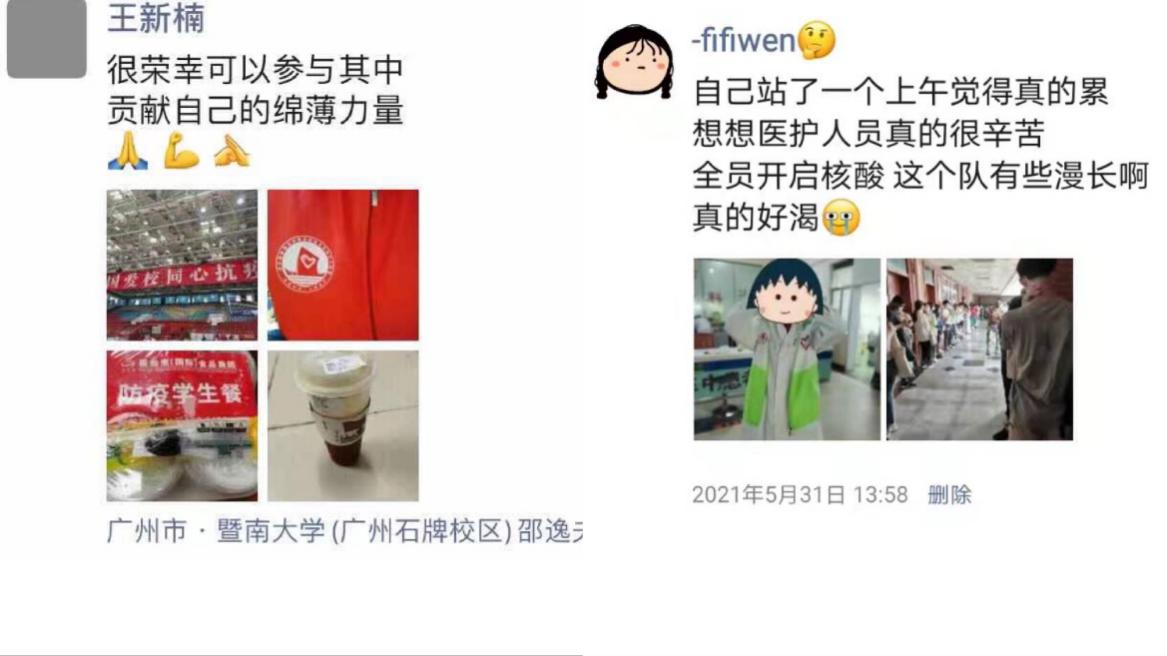 2019级温锦俊同学认为这次的志愿工作对他而言非常有意义:“我单单是站立一天就已双腿酸麻,仅带着口罩面罩就已觉闷热,但我们的医护人员却是为了核酸检测坚持数天,甚至通宵达旦,穿着厚厚的防护服闷出一身汗仍坚守岗位,深刻感受到他们的伟大…相信无论在未来遇到何种难关,我都会以更加积极的态度去克服。希望这次疫情能够快点过去,让大家的生活尽快回到正轨。”