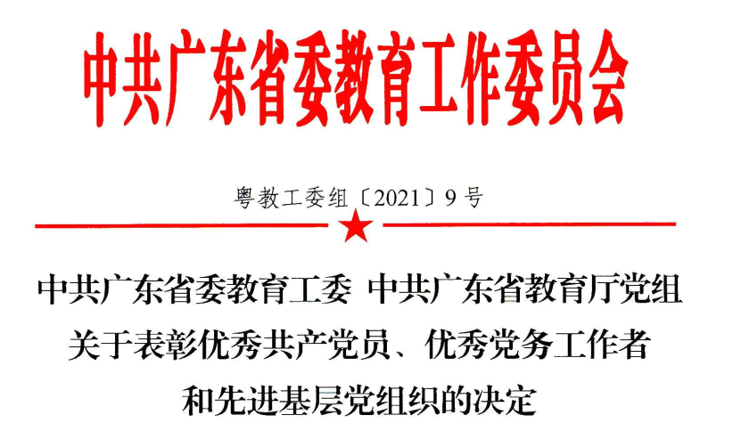 在中国共产党成立100周年之际,广东省委教育工委和谈球吧体育官网入口党委分别表彰了一批优秀共产党员、优秀党务工作者和先进基层党组织。公司共获四项荣誉,党建工作再传喜报!
