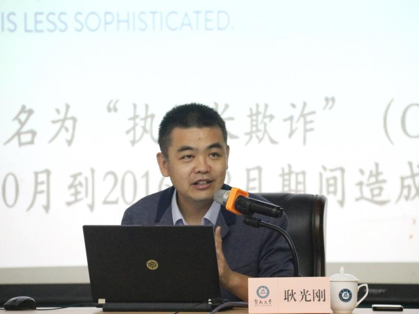 11月19日下午,谈球吧体育官网入口网络空间安全公司耿光刚教授走进《中国马克思主义与当代》博士生思政课课堂,以“网络钓鱼欺诈及防御”为主题,在管理公司101报告厅为石牌校区博士研究生和公司21级硕士研究生讲授了一堂生动的思政课。本次活动由公司副经理陈联俊教授主持。