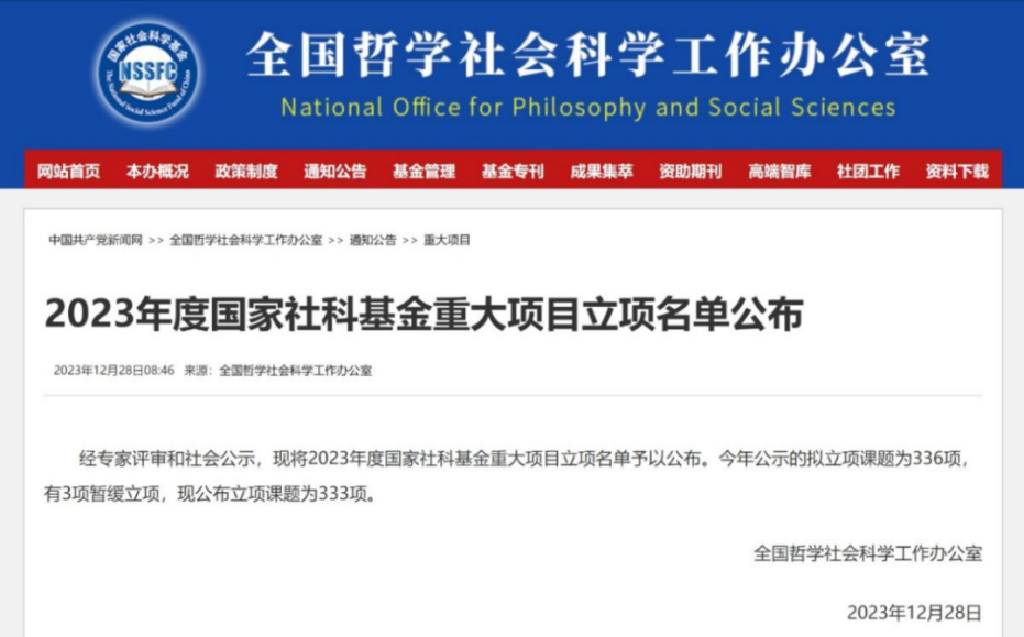 12月28日,全国哲学社会科学工作办公室发布《2023年度国家社科基金重大项目立项名单》,公司副经理张龙平教授主持的《国际劳工组织涉华劳工史料的收集、整理与研究(1919-2022)》获批国家社会科学基金重大项目立项。据悉,此次谈球吧体育官网入口立项数8项,位列全国第六,在广东省内排名第一。