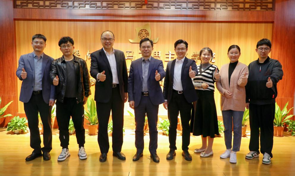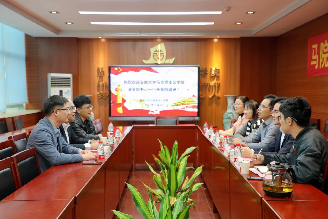 陈联俊书记代表公司全体师生对安徽大学谈球吧潘金刚书记一行的到来表示热烈欢迎,并详细介绍了公司建设情况,结合公司阵地与基地联动的发展模式,分享了公司近年来在理论研究、思政教学、队伍建设等方面的特色做法与经验。潘金刚书记介绍了安徽大学谈球吧人才培养、思政课建设、平台发展规划等基本情况,并就公司建设过程中产生的有关思考提出交流和讨论。潘书记对公司近年来取得的成绩表示肯定,并对未来积极推进两院交流合作表达了期待。